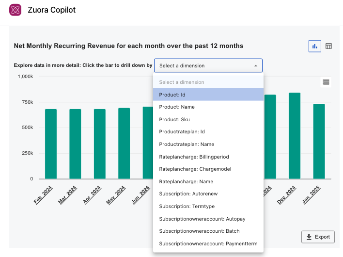 We all know the acronym, AI, has a high and contentious profile. I’ll explain later how we accomplish this, but know that NONE of your Zuora tenant data has been, nor will be, shipped out to a third party LLM. Nor do we hide our use of AI. Copilot is just one AI related feature and like all the others, clearly identifies itself as an AI driven feature. But in this post, we’re only focused on Copilot for Analytics. Please reach out to your Zuora Account Team if you have any questions or concerns about these features and how they work.