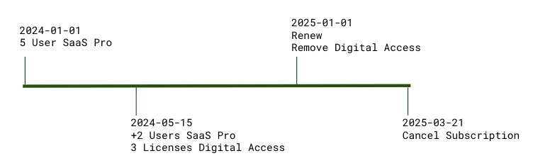 For this tutorial, we will build out this example subscription timeline starting Jan 1st, 2024 and ending March 21st, 2025: