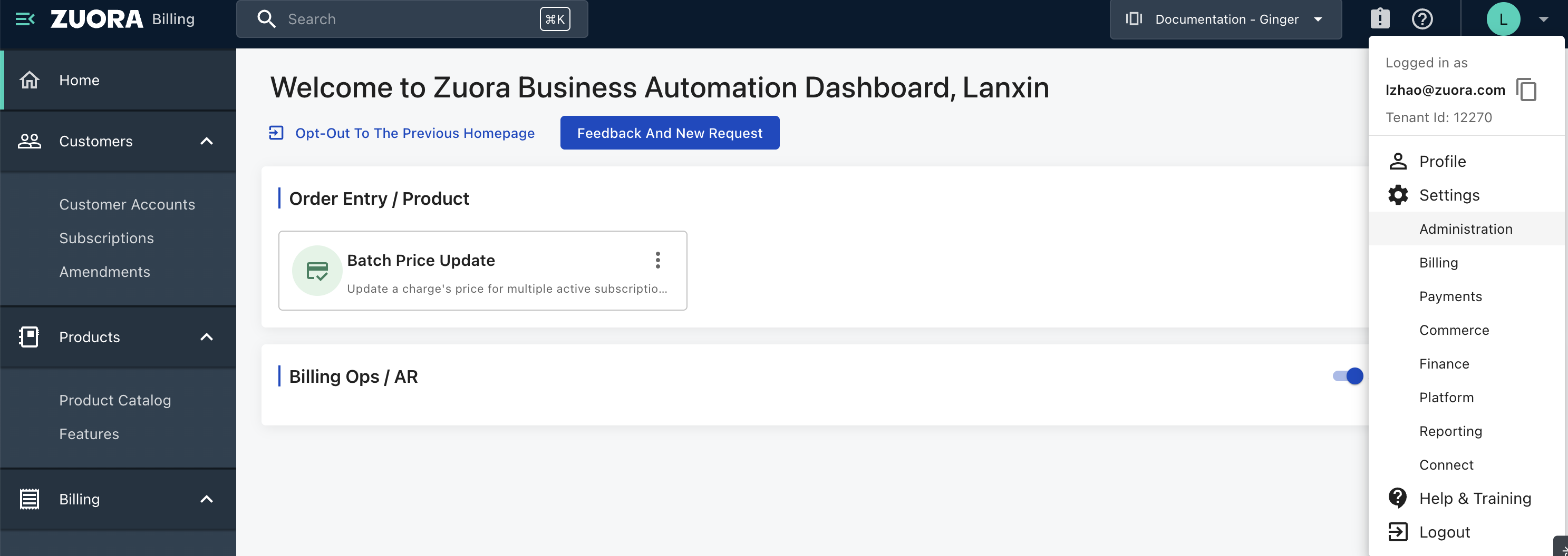 In the upper-right corner, you can find a green circle with your initial. Click it to expand a dropdown menu. If the dropdown includes Administration as the first option under Settings, you are an administrator and can self-provision your client ID and secret. Otherwise, contact your company's Zuora administrator.