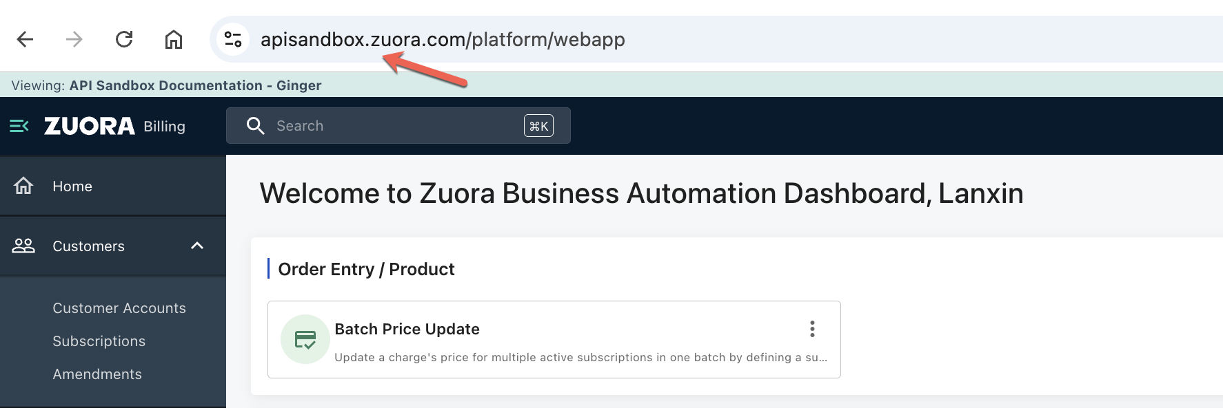 To determine the correct REST endpoint, examine the URL of the user interface. For example, on this page, the URL reads apisandbox.zuora.com.