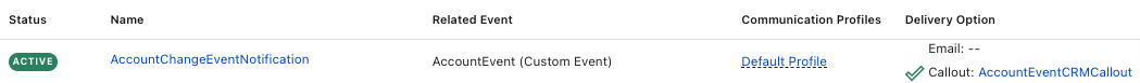 AccountChangeEventNotification, and ensure that the Active toggle is switched on. Click Next. - After reviewing the notification detail, click Done. On the Notifications tab, you should now see your new notification listed:
