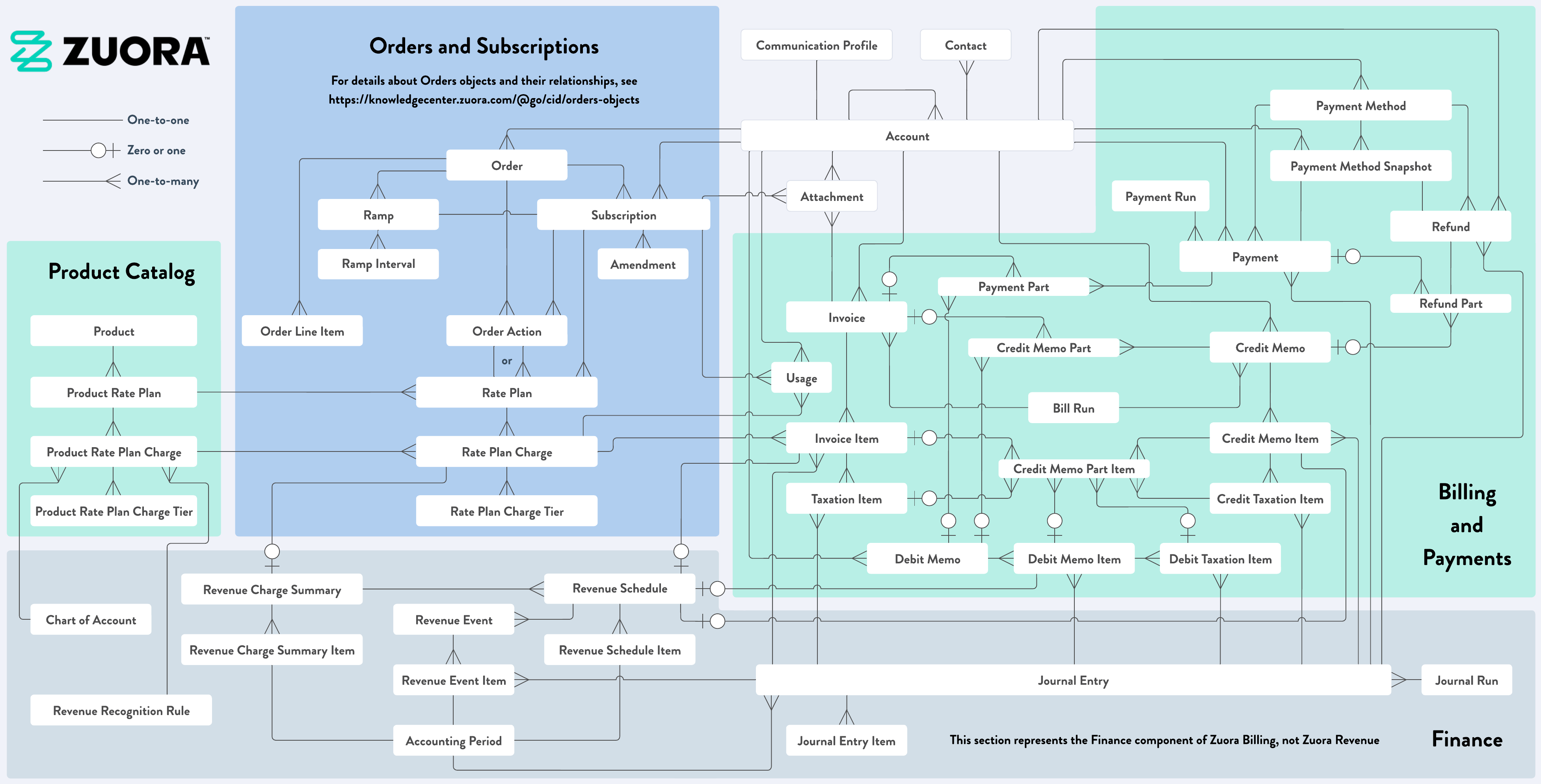 Click the diagram to open it in a new tab and zoom in. For more information about the different sections, see Zuora business object model.